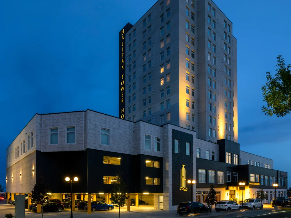 Located just off Highway 102 and 103, in the Bayer’s Lake/Beechville area, the hotel sits within a bustling retail and business district and is a modern, five‑star boutique property just 15 minutes from downtown Halifax. They offer luxury amenities like an indoor pool, rooftop dining with panoramic views, and underground parking for guests. See here for parking information.